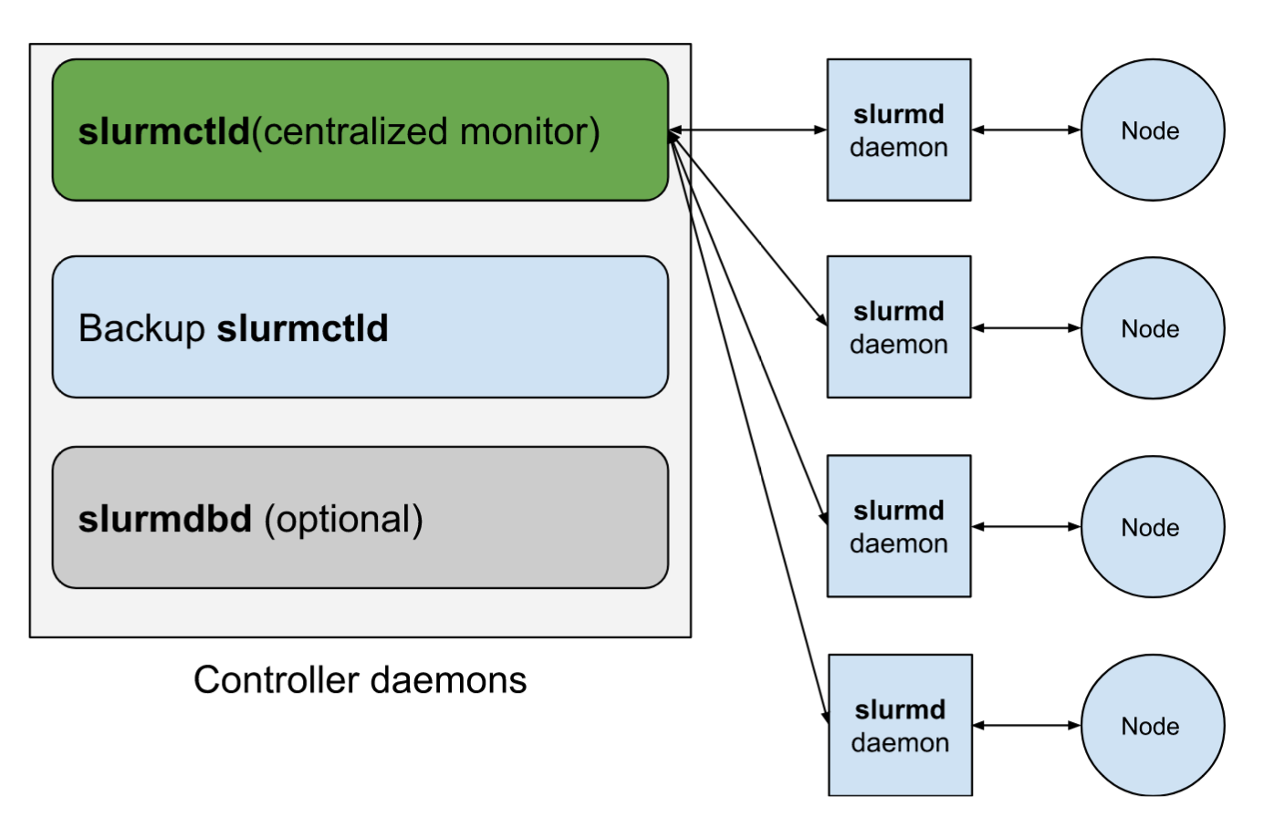 SLURM architecture. Slurm has a centralized manager, slurmctld, to monitor resources and work. Each compute server (node) has a slurmd daemon, which can be compared to a remote shell: it waits for work, executes that work, returns status, and waits for more work.